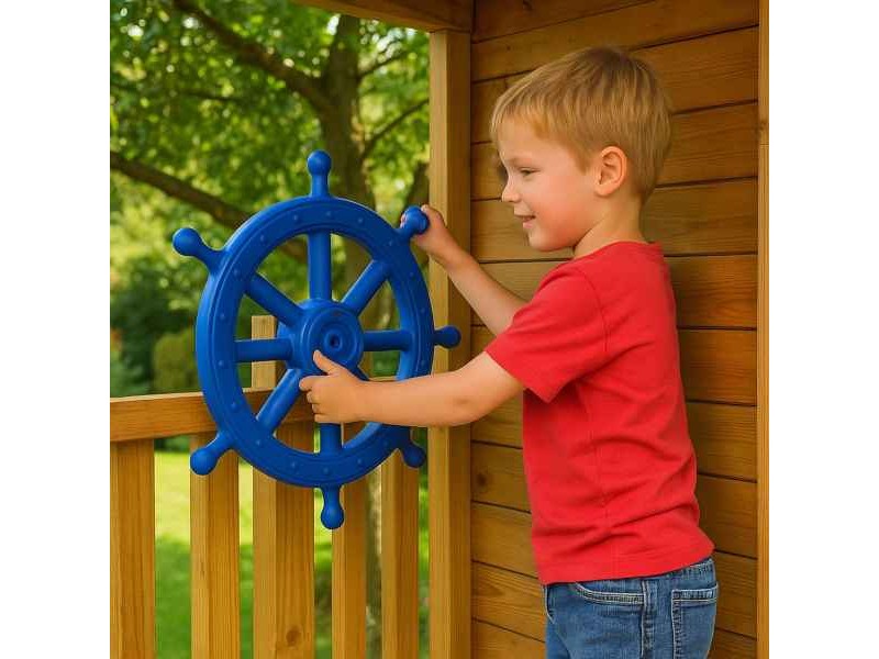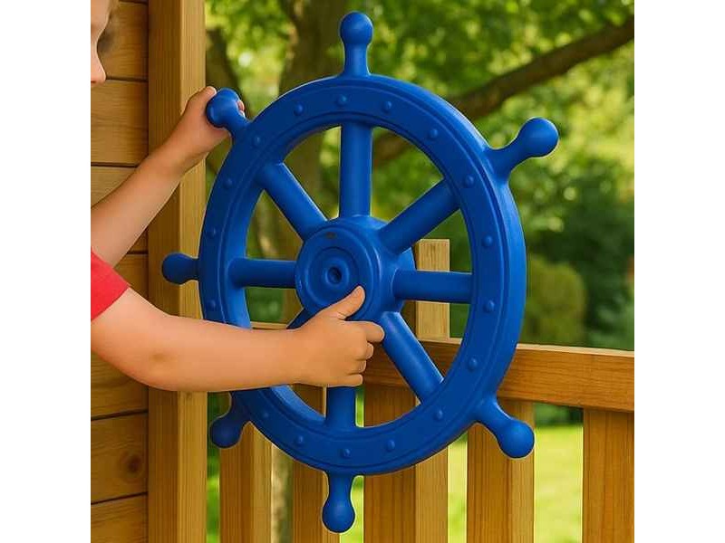 Steering Wheel Boat Blue Ø54 cm and Mounting Kit. The blue children’s ship steering wheel Ø54 cm is a visually striking and functional accessory that transforms any play structure into a pirate ship, sea fortress, or adventure station. Designed for playgrounds, treehouses, wooden playsets, gardens, and themed areas, it offers children a realistic play experience thanks to its smooth rotating mechanism that simulates real ship steering. The large 54 cm diameter makes it visually impressive and easy to use for children of different ages. Made from durable UV-stabilized plastic, the steering wheel is resistant to sunlight, moisture, and outdoor weather conditions, making it ideal for long-term outdoor use. The product includes a complete mounting kit with base, bolt, and washers, ensuring quick and secure installation on wooden or suitable surfaces. Through imaginative role play, this children’s steering wheel actively supports the development of creativity, imagination, and motor skills, encouraging interactive and cooperative play. It is an ideal choice for schools, daycare centers, playgrounds, and home play areas, adding educational value and endless fun. If you are looking for a high-quality outdoor children’s steering wheel with durability, safety, and a strong nautical theme, this model is an excellent option.