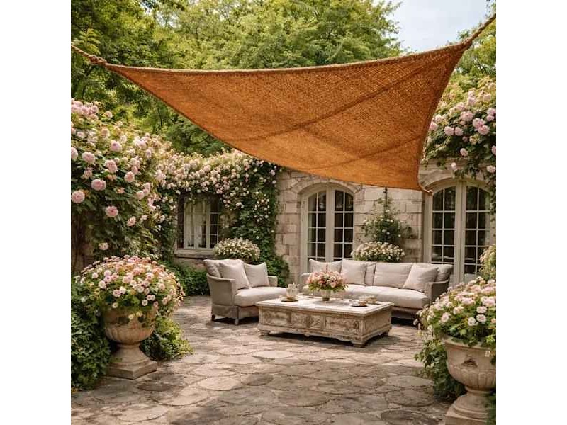 Design of a plain weave patterned sail. Triangular shade net made of coconut fibres for hanging, with 3 fixing points.