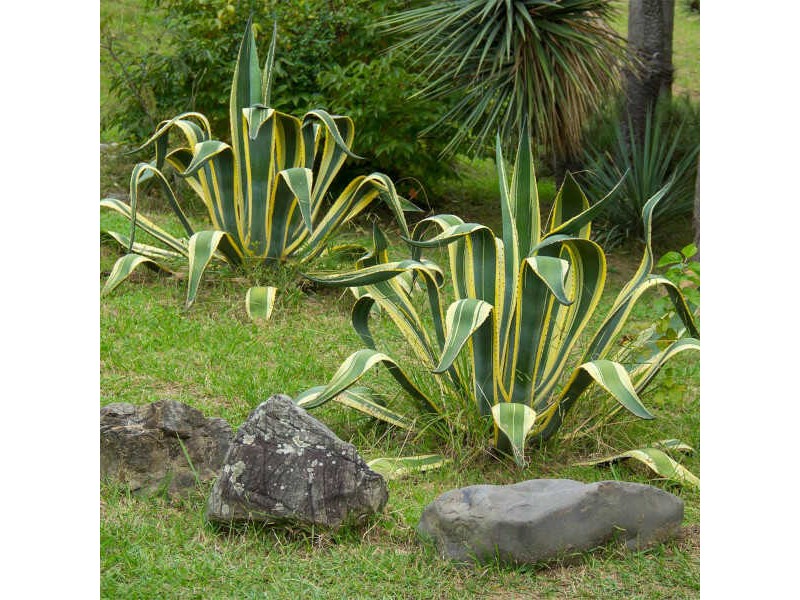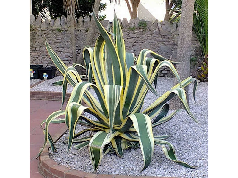 Variegated Century Plant Marginata (Agave americana 'Marginata') - Cacti & Succulents. Perennial evergreen succulent with particular decorative value, which forms offshoots over time. It is a monocarpic species, which means that it blooms only once in its life (after 10 years or more), bears fruit and then dies. However, its place does not remain empty precisely because of the growth of offshoots, which develop into new plants. The Variegated Century Plant has a slow growth rate, medium size, and a spherical shape. Its glaucous or glaucous green leaves are variegated along the margins with yellow to white stripes, spreading from the top of a short and thick stem in a rosette arrangement, are rigidly arched. Their shape is elongated lanceolate, with wavy to thoothed margins, from which small sharp spines are borne. Each leaf ends at the apex in a particularly sharp and large spine, up to 5 cm long, dark brown. The Variegated Century Plant when in bloom displays a striking thick and green paniculate inflorescence, 3 to 9 meters tall, which remains and grows for several months. The flowers are hermaphrodite, tubular, 6-lobed and yellow in color. They are succeeded by brown many-seeded capsule fruits, 4 to 5 cm long. The Variegated Century Plant 'Marginata' (Agave americana 'Marginata') Succulent is a hardy xerophyte plant suitable for potting, for gravel or stony garden soil or for rock gardens. It is used in both gardening and landscape architecture to create, among other things, dry landscape compositions (xeriscaping). When planting, care is taken not to choose locations that are less than 2 meters from paths and corridors.