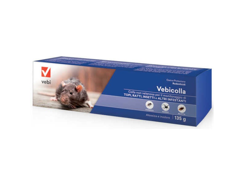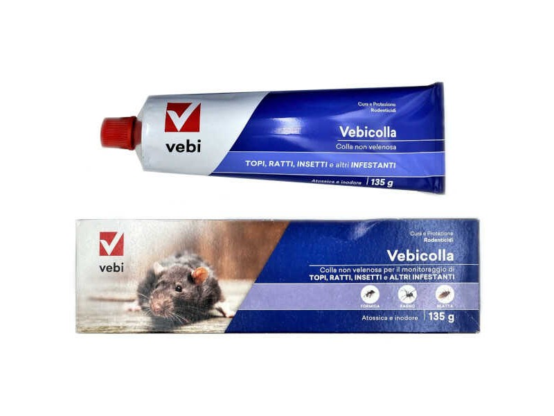 VEBICOLLA Glue Tube 135gr for Mice-Rodents-Insects - Trapping. Particularly effective glue, with action for a long time against house mice and rats (Mus musculus, Rattus norvegicus, Rattus rattus). It has many fibers for greater trapping efficiency. It is applied as a thin layer on a rigid, non-absorbent surface (such as carton or wood) and placed along the pest pathway. The stain can be cleaned with petrol. VEBICOLLA glue 135gr is suitable for indoor and outdoor use in homes and business premises. In addition to killing rodents, it also acts as a trap for all wingless insects.
