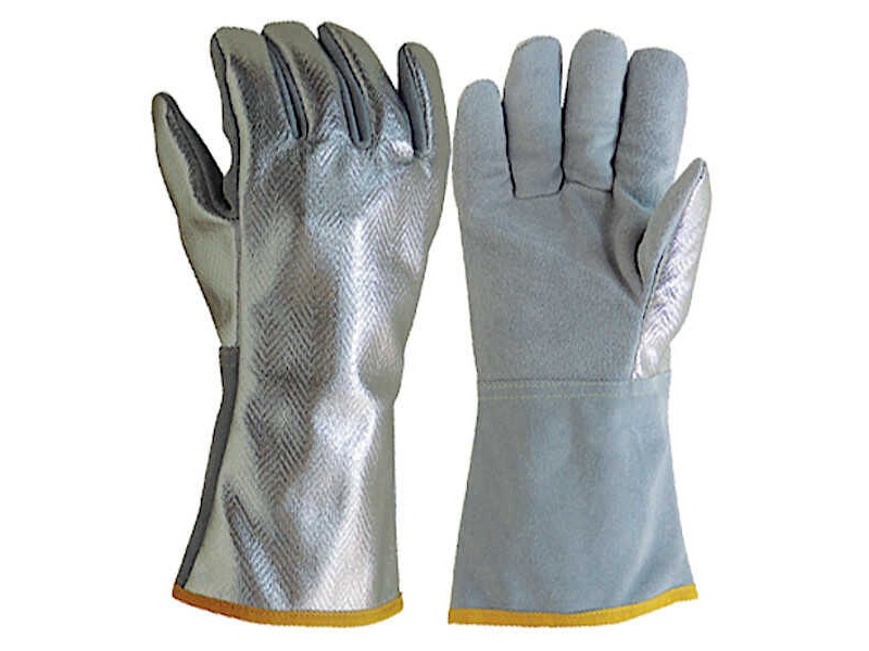 Welding gloves, with leather on the palm and aluminum on the back, lined with fire resistant fabric for better protection and comfort, 35 cm. Suitable for professional or amateur use, and especially for workers in industries and factories. They are easy to wash and clean. Certified according to EN388, EN407, EN420 standards. Size 10.5 available.