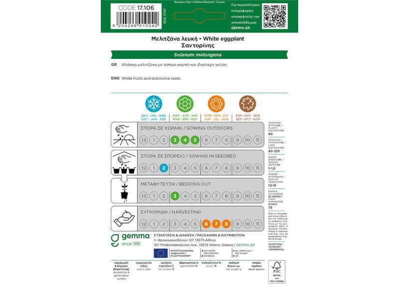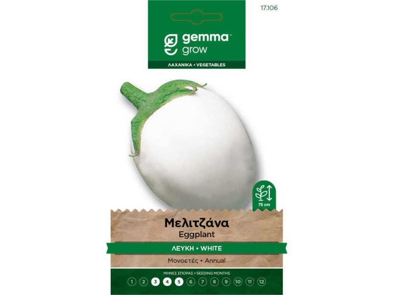 White Eggplant Seeds 0.4g Packet (Solanum melongena 'Santorinis'). Annual. Eggplant bottle with white fruit and special taste. Plant distance (cm): 80. Row distance (cm): 80-120. Sowing depth (cm): 1-1.5. Germination days: 12-15. Start of harvest (days): 75. Available in a 0.4g envelope.
