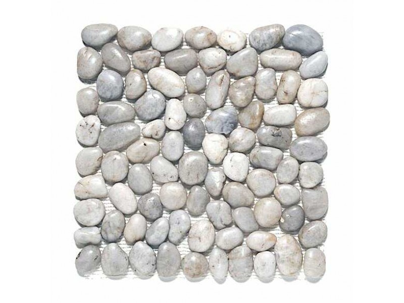 White Polished Pebble in Net 30x30cm. The White pebbles in a net come from natural stone and have been specially treated to obtain a glossy texture and a polished look. They are placed indoors (living room, kitchen, bathroom, etc.) as well as outdoor (stairs, terraces, patios, etc.), adding a great decorative and useful touch. All pebbles in a net - such as the White Polished Pebble in Net - because they come from natural rocks, keep their shine and colors stable regardless of exposure.