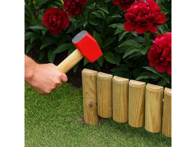 This low wooden garden border fence is a stylish and functional solution for enhancing and organizing outdoor spaces with a natural decorative touch.