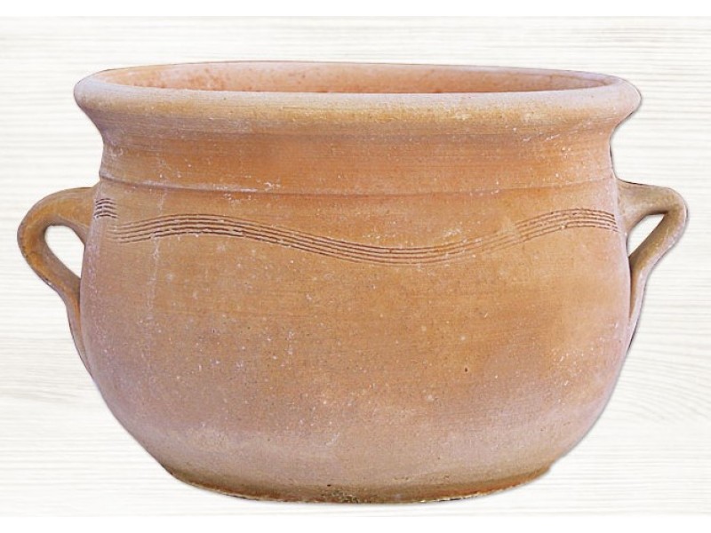 The handmade Round Clay Plant Pot TSIKALI ME XERI Ø30x(H)18cm light brown-terracotta color is included in the Series of CRETE terracotta and ceramic machine pots and planters, manufactured by the leading Greek company in the production of high quality ceramic - pottery products Ceramart. Round Clay Plant Pot TSIKALI ME XERI Ø30x(H)18cm has the spherical shape of a tsukali (tsikali is the name of the cooking pot, stewpot, in the Cretan dialect). It features prominent curved rim, two handles, while the body is adorned by a wavy strip of fine incised lines. It is made of specially processed light colored clay that gives it exceptional stability and durability. It should be noted that the form of the pot is based on traditional designs, and that there are small differences between the pots, depending on the artist-potter.