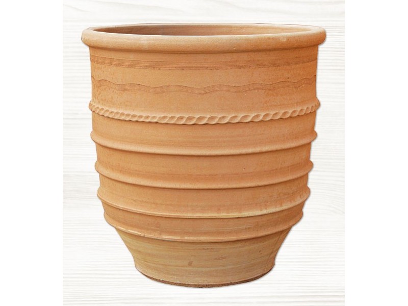 The handmade Round Clay Plant Pot EXARA Ø40 x (H)38cm light brown-terracotta color is included in the Series of CRETE terracotta and ceramic machine pots and planters, manufactured by the leading Greek company in the production of high quality ceramic - pottery products Ceramart. Round Clay Plant Pot EXARA Ø40 x (H)38cm is cylindrical in form with a downward-converging base, decorated with horizontal lines and ribbon-like shapes and has a slightly projecting rim. It is made of specially processed light colored clay that gives it exceptional stability and durability. It should be noted that the form of the pot is based on traditional designs, and that there are small differences between the pots, depending on the artist-potter.