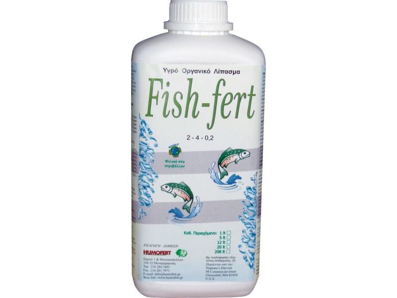 The Fish-fert is a liquid organic fertilizer derived from the cold enzymatic hydrolysis of fresh fish in the North Atlantic Ocean. Due to this special treatment of the fish, Fish-fert retains all the Vitamins, Amino Acids, Enzymes, Proteins, Oils and Growth Hormones that are pre-existing in the fish. In addition, Fish-fert contains many macro and micro nutrients in chelated form.