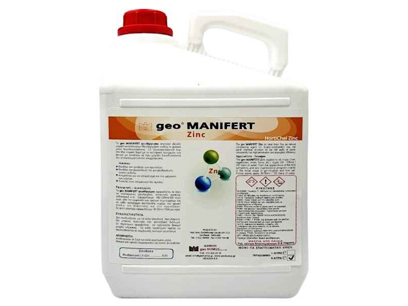 Geo MANIFERT Zn 4L Liquid Zinc Fertilizer by GeoHUMUS®. The Geo MANIFERT Zn 4L is a liquid zinc fertilizer by GEO HUMUS, designed to enhance the vitality of plants. Its main function is to promote the synthesis of chlorophyll, essential for photosynthesis, the process that allows plants to produce food. This fertiliser stands out thanks to the natural complexing agent LSA (Ammonium Lignosulfonate). This substance, with a chemical structure similar to plant cell walls and soil humus, facilitates the direct and efficient penetration and absorption of zinc by plants, without any risk of phytotoxicity. The zinc supplied by Geo MANIFERT Zn is a critical component for the smooth functioning of various enzymes, which in turn catalyze important metabolic reactions in all crops. The absence of these enzymes would lead to inhibition of plant growth. In particular, zinc sufficiency is essential for the normal production of carbohydrates, proteins and chlorophyll. On the contrary, its deficiency has significant negative effects, resulting in reduced production of these important nutrients, negatively affecting overall plant health and productivity.