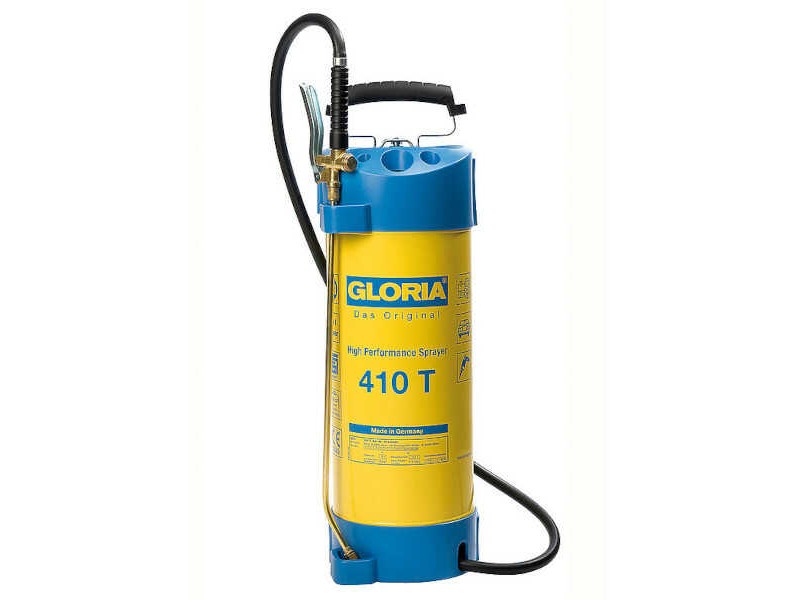 High Performance Sprayer 10lt GLORIA 410 T G000410.0900. Made in Germany, general purpose hand sprayer, by GLORIA. The high-performance sprayer 410 T made of robust steel offers a high degree of comfort and quality with its extensive equipment and convinces by a safe handling.With a high-quality interior coating made of plastic that protects the interior of the container against corrosion and simplifies the cleaning of the device, the 10 litre model is ideally suited for use in medium-sized and large gardens, but also does not shy away from daily use in professional agriculture. A bottom ring ensures a safe stand even on uneven ground. Thanks to a hose connection at the container bottom, the applied medium is used up to the last drop. The laborious disposal of residues in the container is not necessary. The High Performance Sprayer 10lt GLORIA 410 T is TUV & GS certified, as well as it has a complete range of spare parts.