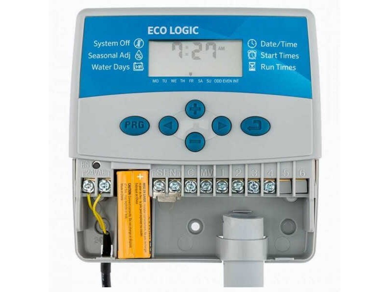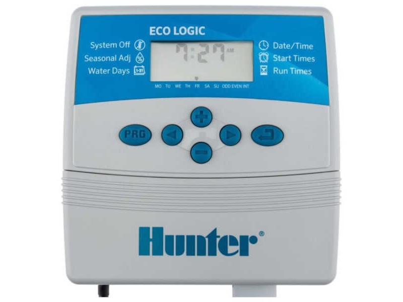 Hunter Eco Logic Automatic AC Powered Irrigation Controller 6-Station Indoor - Irrigation Controllers. The Hunter Eco Logic electronic garden and lawn watering controller is a reliable and economical irrigation control solution for small areas. It has low cost, advanced technological features and is easy to install. Features easy-to-use programming buttons, Quick Check™ technology, two independent programs with four start times each, 365-day calendar, seasonal adjustment (10% to 150%), sensor compatibility and non-fading memory. It is available in 2 models with 4 and 6 stations and incorporates properties that optimize the performance of the irrigation system. With its simplicity, reliability and cost savings, the Hunter Eco Logic Irrigation Controller is the right choice for matching performance requirements.