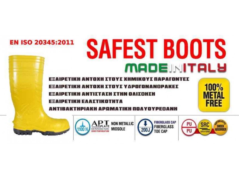 Cofra Electrical Safest SB E P FO CI SRC Work Galoshes. Safety Boot comes with the special PU compound protects against the cold down to minus 25 degrees centigrade. The Cofra Safest range are light in weight and constructed with the non metallic safety features. Good Metatarsal support giving all day comfort with good shock absorption. Excellent resistance to hydrocarbons and soaked for 7 days in naphtha, gasoline and salt water with no change to any of it’s properties. The Cofra Electrical Safest SB E P FO CI SRC Work Galoshes are manufactured in Italy and are available in yellow color and a wide range of sizes, including large numbers (38-48).