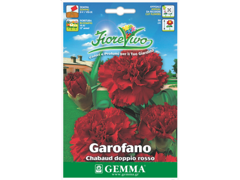 Carnation Double Red Seeds 0.4g Packet (Dianthus caryophyllus). Biennial. Suitable for pots, edging and flower beds. Excellent for cut flower. It looks for places with full exposure to the sun or partial shade. Seed spacing (cm): 20. Row spacing (cm): 40. Sowing depth (cm): 0.5-1. Days to germination: 15. Start of flowering (days): 90. Available in a 0.4 g envelope.