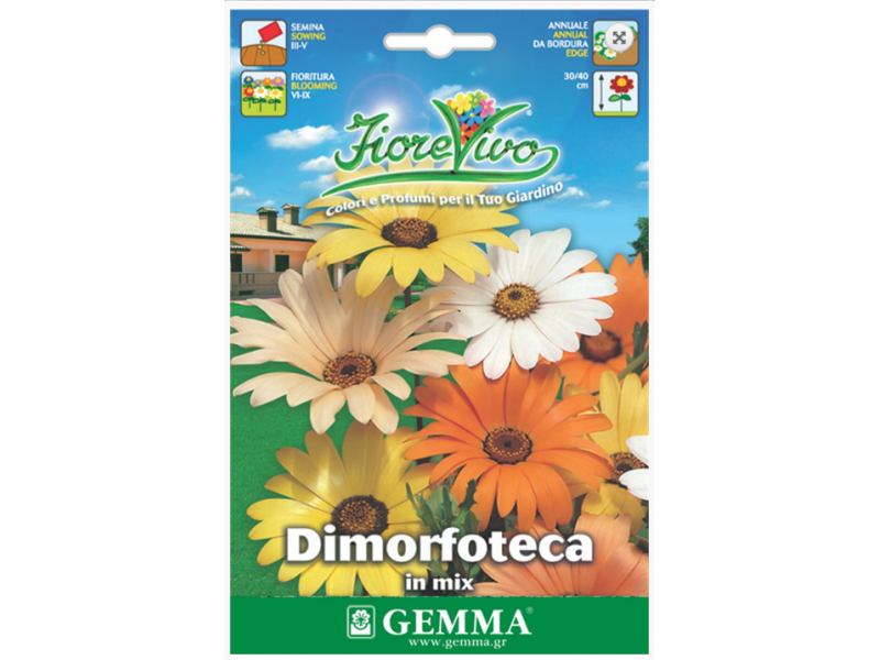 Διμορφοθήκη Μίγμα 0,3g Σπόροι Φάκελος (Dimorphotheca aurantiaca). Μονοετές. Κατάλληλο για γλάστρα, μπορντούρα και παραθαλάσσιες περιοχές. Επιζητά θέσεις ημισκιερές. Απόσταση φυτών (εκ.): 20. Απόσταση γραμμών (εκ.): 30. Βάθος σποράς (εκ.):0,5. Ημέρες φυτρώματος: 10-12. Έναρξη ανθοφορίας (ημέρες): 60. Διατίθεται σε φάκελο των 0,3 g.