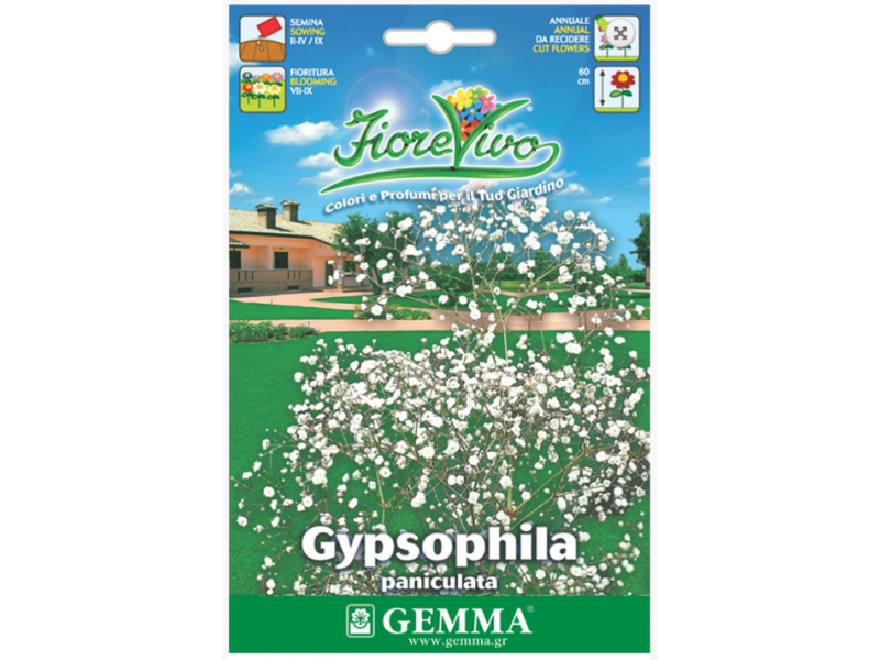 Γυψοφίλη Μικρό Άνθος 2,5g Σπόροι Φάκελος (Gypsophila paniculata). Διετές. Κατάλληλο για παρτέρι. Εξαιρετικό για δρεπτό άνθος (κομμένο λουλούδι). Επιζητά θέσεις με πλήρη έκθεση στον ήλιο ή ημισκιερές. Απόσταση φυτών (εκ.): 20. Απόσταση γραμμών (εκ.): 50. Βάθος σποράς (εκ.):0,2. Ημέρες φυτρώματος: 10. Έναρξη ανθοφορίας (ημέρες): 120. Διατίθεται σε φάκελο των 2,5 g.