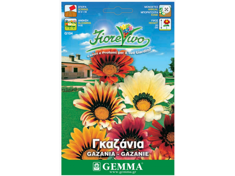 Γκαζάνια Μίγμα 0,15g Σπόροι Φάκελος (Gazania splendens). Πολυετές. Κατάλληλο για γλάστρα, μπορντούρα, παρτέρι και παραθαλάσσιες περιοχές. Επιζητά θέσεις με πλήρη έκθεση στον ήλιο. Απόσταση φυτών (εκ.): 30. Απόσταση γραμμών (εκ.): 40. Βάθος σποράς (εκ.):0,2. Ημέρες φυτρώματος: 10. Έναρξη ανθοφορίας (ημέρες): 60. Διατίθεται σε φάκελο των 0,15 g.