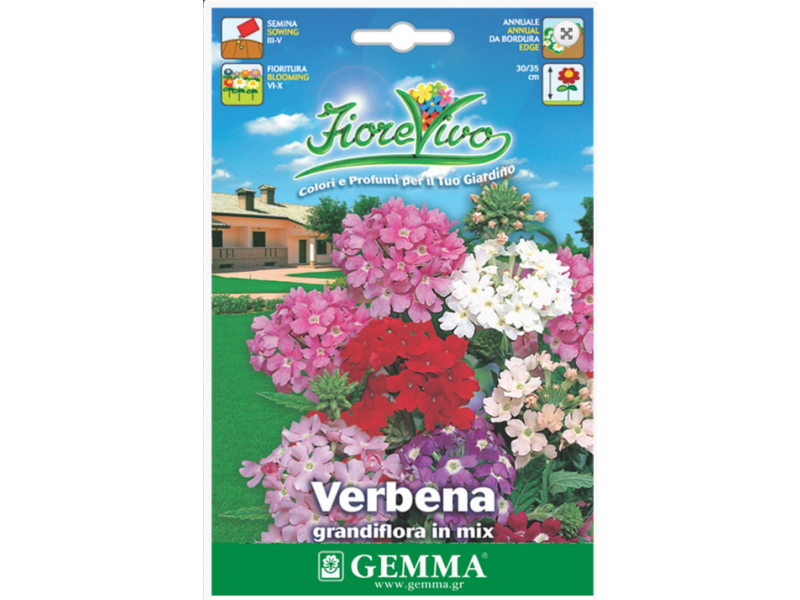 Βερβένα Γίγας Μίγμα 0,2g Σπόροι Φάκελος (Verbena × hybrida). Μονοετές φυτό. Κατάλληλο για κήπο, παρτέρι, μπορντούρα, γλάστρες, ζαρντινιέρες και κρεμαστά καλάθια. Για την ενίσχυση της πλούσιας ανθοφορίας συνιστάται η αφαίρεση των ξερών λουλουδιών. Επιζητά θέσεις με πλήρη έκθεση στον ήλιο. Απόσταση φυτών (εκ.): 20-25. Απόσταση γραμμών (εκ.): 40. Βάθος σποράς (εκ.): 0,2. Ημέρες φυτρώματος: 10. Έναρξη ανθοφορίας (ημέρες): 30. Διατίθεται σε φάκελο των 0,2 g.