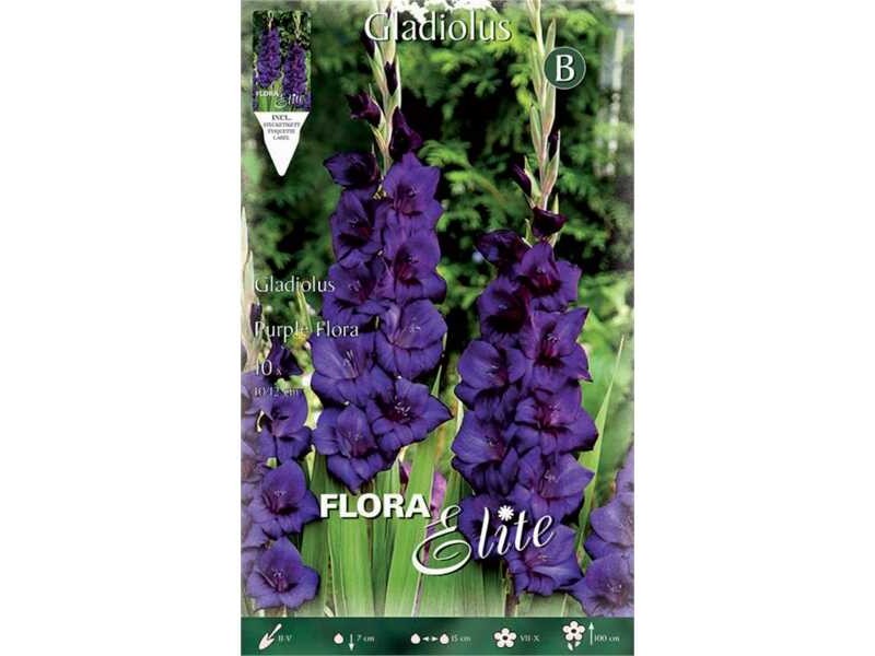 Βολβοί μονόχρωμης υβριδικής Γλαδιόλας με βαθύ βιολέ χρώμα άνθους. Η ποικιλία Purple Flora είναι βολβώδες φυτό ανοιξιάτικης φύτευσης το ύψος του οποίου μπορεί να φτάσει το 1 m. Οι Γλαδιόλες ανθοφορούν περίπου 12 εβδομάδες μετά την φύτευσή τους, με μεγάλου μεγέθους και εντυπωσιακών χρωμάτων άνθη. Οι βολβοί των Γλαδίολων μπορούν να φυτευτούν στον κήπο ή σε γλάστρα και ζαρντινιέρα. Για την φύτευση σε γλάστρες και ζαρντινιέρες απαιτείται υψηλής ποιότητας εδαφικό μείγμα, καθώς και ελαφρόπετρα ή άλλο παρεμφερές υλικό υλικό, στην περιοχή του πάτου, για διευκόλυνση της στράγγισης, η οποία στην περίπτωση των βολβωδών φυτών πρέπει να είναι άριστη. Η διαδοχική ανά 15 ημέρες φύτευση του Γλαδίολου Purple Flora εξασφαλίζει την συνεχή ανθισμένη παρουσία του.