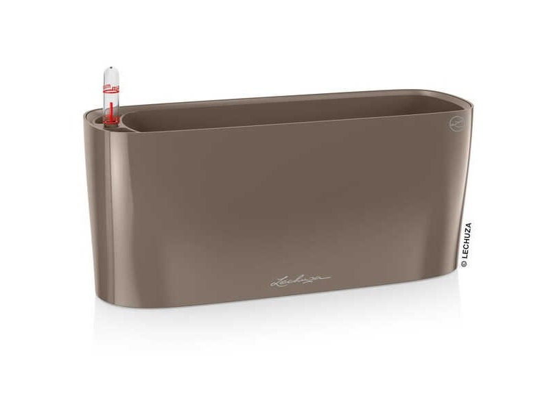 DELTA 20 Καφέ 40x15x18cm Lechuza Αυτοποτιζόμενη Ζαρντινιέρα-Κασπώ. Οι επιτραπέζιες ζαρντινιέρες-κασπώ DELTA αποτελούν θαυμαστού σχεδιασμού φυτοδοχεία, των οποίων χαρακτηριστικό γνώρισμα αποτελεί το απαλό καμπύλο σχήμα των δύο μικρότερων πλευρών. Έχουν στενή βάση και ελαφρώς πλατύτερο άνοιγμα, η δε εξωτερική επιφάνειά τους είναι στιλπνή. Προσφέρονται για την διακόσμηση κάθε είδους τραπεζιών ή επιφανειών (όπως πάγκοι κουζίνας, περβάζια παραθύρων, κ.λπ.), ιδίως εκεί όπου ο διαθέσιμος χώρος είναι στενός. Αναδεικνύουν ιδιαίτερα τα μικρής ανάπτυξης φυλλώδη καλλωπιστικά φυτά ή τα αναλόγου ανάπτυξης ανθόφυτα όπως οι μίνι ορχιδέες. Είναι κατάλληλες για εσωτερικούς χώρους, ενώ παρέχονται ως πλήρες σετ, μαζί με το ανεξάρτητο δοχείο φύτευσης, το σύστημα αυτοποτισμού καθώς και με το Lechuza-Pon, το ειδικό υπόστρωμα φύτευσης της LECHUZA. Το αποκλειστικό σύστημα άρδευσης της LECHUZA (Sub-Irrigation System) εγγυάται την βέλτιστη παροχή νερού και θρεπτικών στοιχείων στα φυτά για 3 έως 4 μήνες. Οι αυτοποτιζόμενες ζαρντινιέρες-κασπώ DELTA διατίθενται σε τέσσερα χρώματα, Λευκό, Καφέ, Κόκκινο, και Ανθρακί.