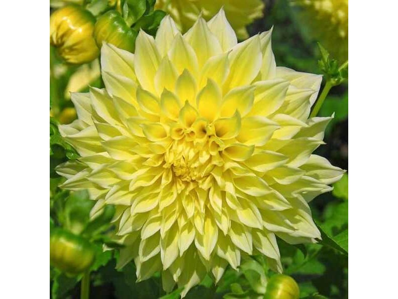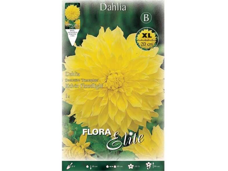 Kelvin Floodlight Dinnerplate Dahlia: tuberous rhizome of Dahlia cultivar with yellow color of a huge flower about 30 cm in size. The Kelvin Floodlight Dinnerplate Dahlia is tuberous deciduous perennial, shrubby and spring planting, the height of which can reach fom 0.90 up to 1.10 m. Dahlias blooms about 10 to 12 weeks after planting, with large and strikingly colored flowers, while their flowering begins in early summer and lasts until autumn. Dahlia tuberous can be planted in the garden or in a pot and planter. Planting in pots and planters requires a high quality soil mixture, as well as pumice or other similar material, in the area of the flowerpot bottom, to facilitate drainage, which in the case of tuberous plants should be excellent.