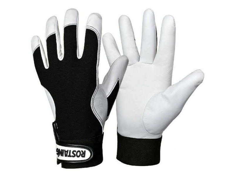 Για να βρεθεί το σωστό μέγεθος γαντιού Rostaing, τοποθετείται το αριστερό χέρι πάνω σε λευκό χαρτί. Με ένα μολύβι δημιουργείται το περίγραμμα. Κατόπιν μετράται η απόσταση από το εσωτερικό του αντίχειρα μέχρι απέναντι - όπως δείχνεται στο παρακάτω μεγεθολόγιο. Το μήκος της γραμμής σε εκατοστά αντιστοιχεί στο κατάλληλο μέγεθος του γαντιού. Εάν το σωστό μέγεθος είναι μεταξύ 2 άλλων, προτείνεται να επιλεγεί το μεγαλύτερο από τα δυο.